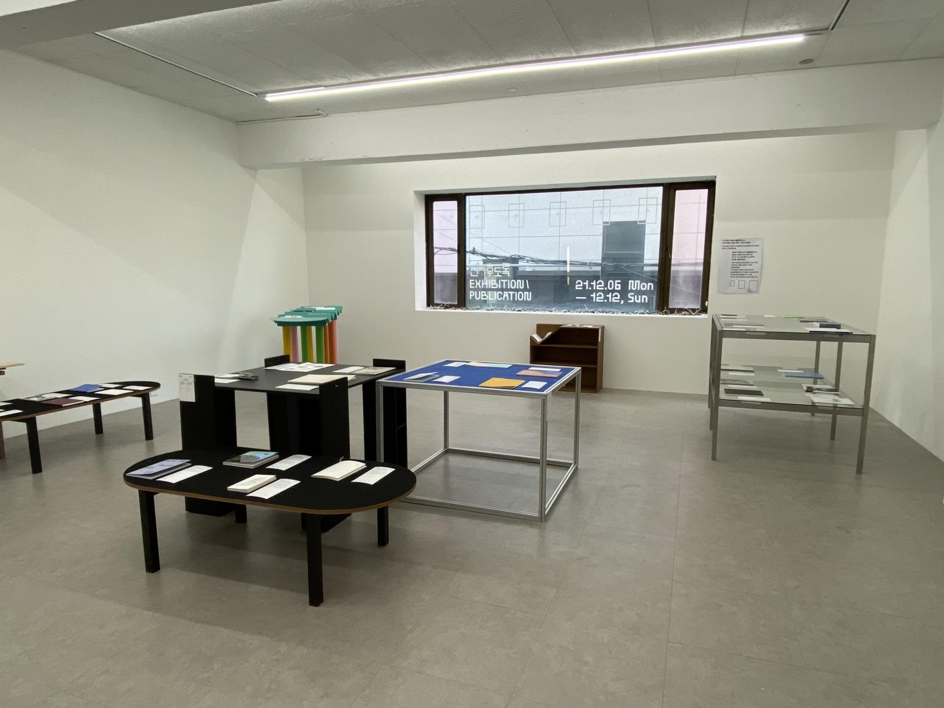 아쉽게도 2020년에 열린 1회 프로그램에 참여하지 못했지만 마침 2021년 12월에 성북구에 위치한 WESS 공간에서 열린 두 번째 전시를 방문할 수 있었다. 넓지 않은 공간에 책자를 올려둘 수 있는 각양각색의 테이블이 배치되어 있고, 테이블 위에 또한 각양각색의 책자들이 비치되어 있었다. 약 45개의 출판물 옆에 놓이진 종이에는 숫자와 해당 도록이 어떤 전시의 도록인지에 대한 설명, 크레딧이 기재되어 있었다. 비치된 도록은 열람용이며 관람객 1인당 원하는 도록을 3권씩 가져갈 수 있었는데, 도록에 매겨진 숫자를 기록해 두었다가 PICK-UP 장소에 가서 숫자를 말하면 받을 수 있는 시스템이었다.