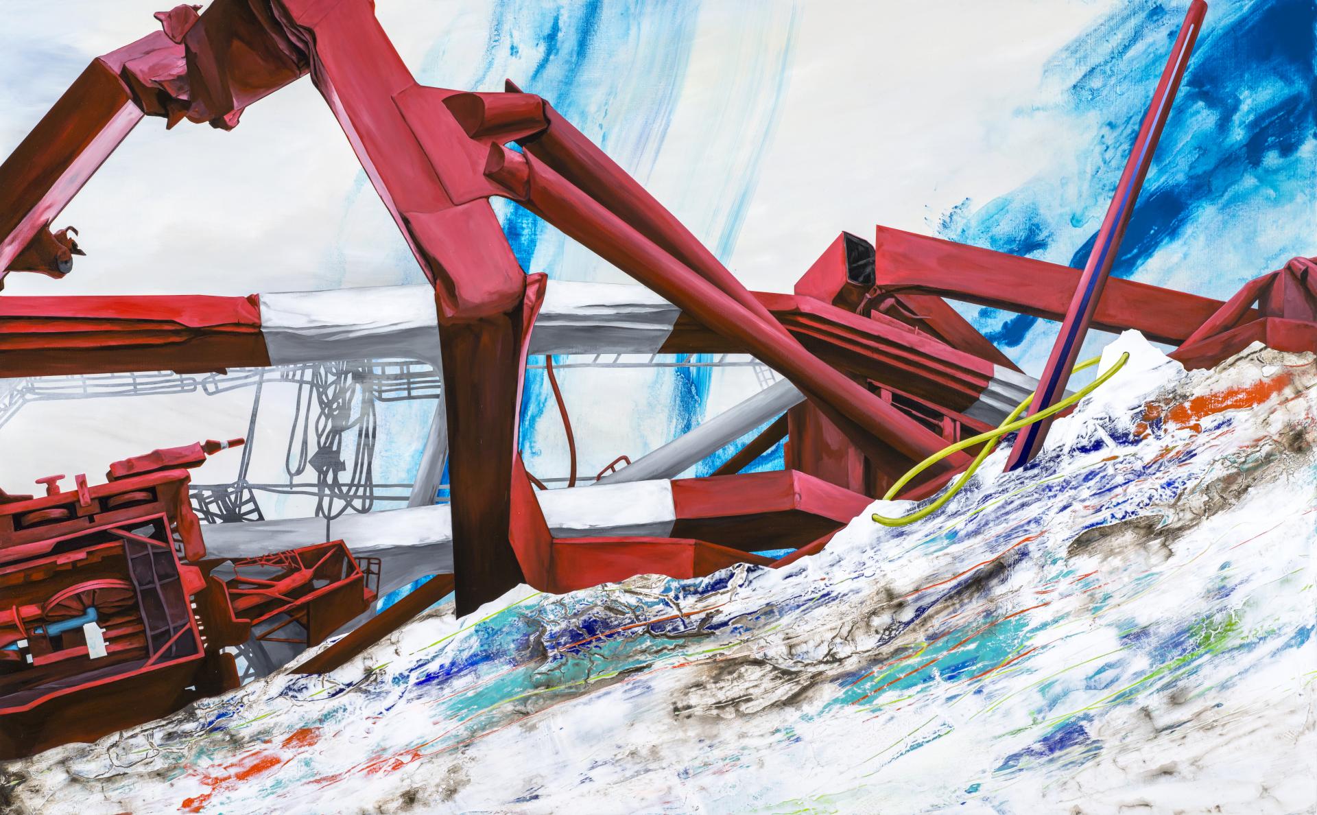 So the scene of disaster that Chou Taichun (周代焌) presents is compromised by dazzling colors that would not fit in with the disaster at all, and by some transcendental forms mixed with the landscape of reality. Through the big and small disasters that he has observed in Taiwan, he realized that the situation depends on this interface, that is, on ‘how and what to communicate, accept, and combine’, rather than on the quantitative/qualitative details of the disaster itself. What he unfolds on the canvas is the scene that has been through the interface.