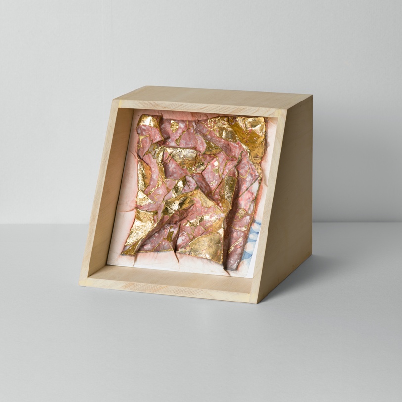 감추어둔 한 줌의 땅 01(2025, 장지에 주묵, 분채, 호분, 금분, 금박, 오동나무, 27 × 27 × 25 cm)