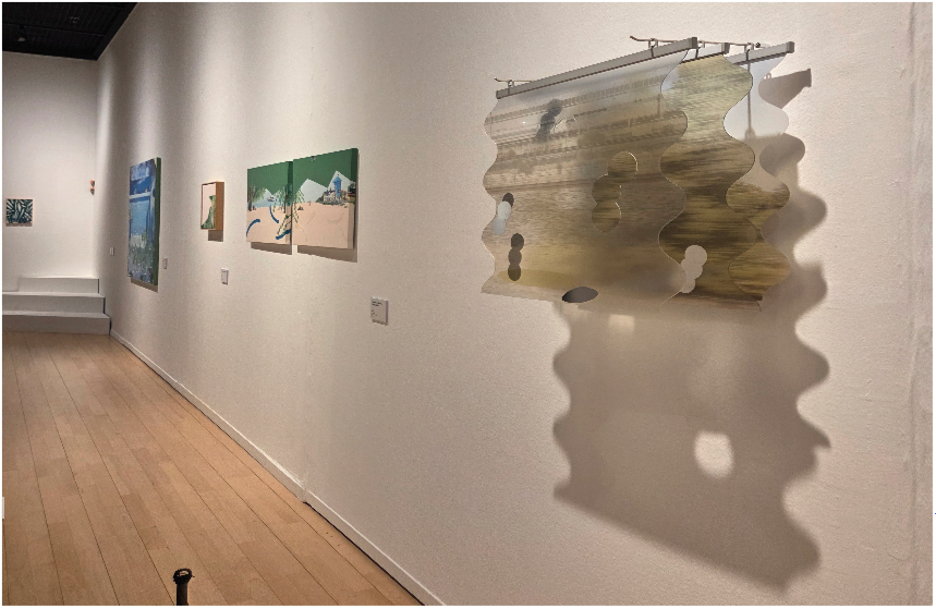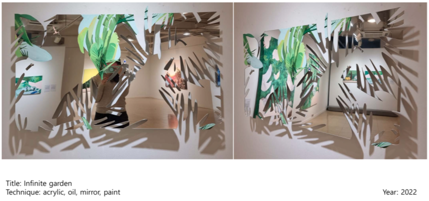 리드미컬한 레이어/층위의 사유는 설치 작업인 거울 작업으로 확장된다. 거울은 최종의 표면인 동시에, 끝나지 않는 레이어다. 하나의 이미지가 거울을 통해 복수로 증식하고, 관람자의 움직임에 따라 프레이밍이 바뀐다. 거울은 면치기보다 더 과감하게 화면을 잘라낸다. 잘라냄은 배제라기보다 개입의 요청이다. 관람자의 위치가 달라질 때마다 풍경은 갱신된다. 그 갱신은 우발적이되 임의적이지 않다. 전시는 예측 불가능성과 구조적 필연성 사이의 균형을 설계한다. 작가에 의해 제시된 거울 앞에 선 관람자는 관찰자이자 이미지의 공급자로 위치한다. 그림은 더 이상 고정된 프레임의 광경이 아니다. 은경(銀鏡) 작업은 복수의 레이어가 동시다발적으로 겹치고 흔들리는 체험의 장이 된다. 반사된 풍경이 반사를 다시 반사할 때, 레이어는 기하급수적으로 늘어나고, 그 과잉은 하나의 질문으로 수렴한다. 우리는 무엇을 바라보고 있는가. 지금 반영(reflection)되고 있는 것은 어떠한 ‘지금’인가.