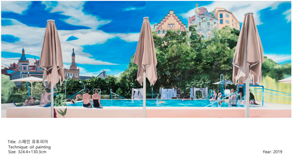 우리가 손모아의 작업 앞에서 마주하는 것은 ‘있었던 세계’가 아니라, 우리가 어쩌면 도달해야 한다고 믿는, 그러나 늘 어긋난 채 남아 있는 ‘있어야 할 세계’다. 그림 속에서 분절되어 나타나는 휴양지의 풍경 조각 조각들은 실제의 모습 이전에 매체 속에서 살아난 환상에 가깝다. 여행을 가야 한다고 속삭이는 광고와 잡지, 브로슈어와 포스터, 그리고 끊임없이 업데이트되는 SNS의 이미지들이 우리의 기억 속에 관습적 풍경을 미리 완성하곤 한다. 손모아가 매년 여행을 통해 수집하는 장면들은 이러한 관습적인 기억을 토대로 재조합된 유토피아적인 풍경의 한 단면이다. 그의 그림은 그래서 ‘기록’이라기보다 ‘회상’이고, ‘실재’라기보다 이미지의 습성이 드러나는 ‘환상’이다. 그의 회화는 바로 이 환상이 움직이는 방식을 포착한다.