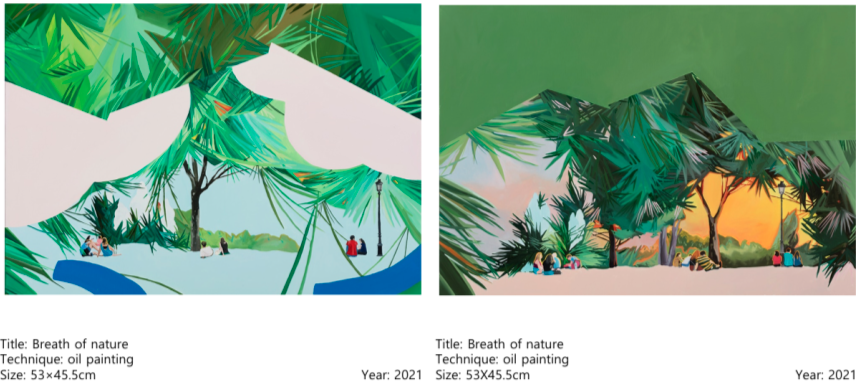 그의 색 면은 구체적인 현실을 지우는 동시에 환상의 배경을 만든다. 이 양가적 작동이 손모아 회화에 감각적인 리듬을 형성한다. 일부 작품에는 추상과 구상이 혼합되어 있다. 작은 이미지를 확대해 그리면서 윤곽이 미세하게 희미해졌다. 아주 작은 인물의 뚜렷한 형상과 커다랗고 흐릿한 광경이 한 평면에 공존한다. 적층 된 표면의 가장자리가 흐려지고, 윤곽은 현실적인 소실점을 잃는다. 이러한 표현은 <Breath of nature>와 같은 작품 연작에서 더욱 두드러진다. 팝아트 같은 색면 추상 사이 인물들의 묘사는 구체적이다. 서로 다른 표현 기법들의 충돌은 한 화면 안에서 감각의 박자를 틈틈이 달라지게 한다. 더불어 뒤섞인 소재들이 풍경의 시간과 장소를 통합한다. 이 풍경의 혼재는 실제로는 존재하지 않는 장소에 대한 묘사가 아닐까. 이때 회화는 재현의 장르라기보다 기억과 욕망을 재배열하는 장치가 된다. 이런 과정을 거치며 손모아의 그림 속에서 현실은 실재가 기호로 바뀌는 순간에 열리는 또 다른 장(場)이 된다.