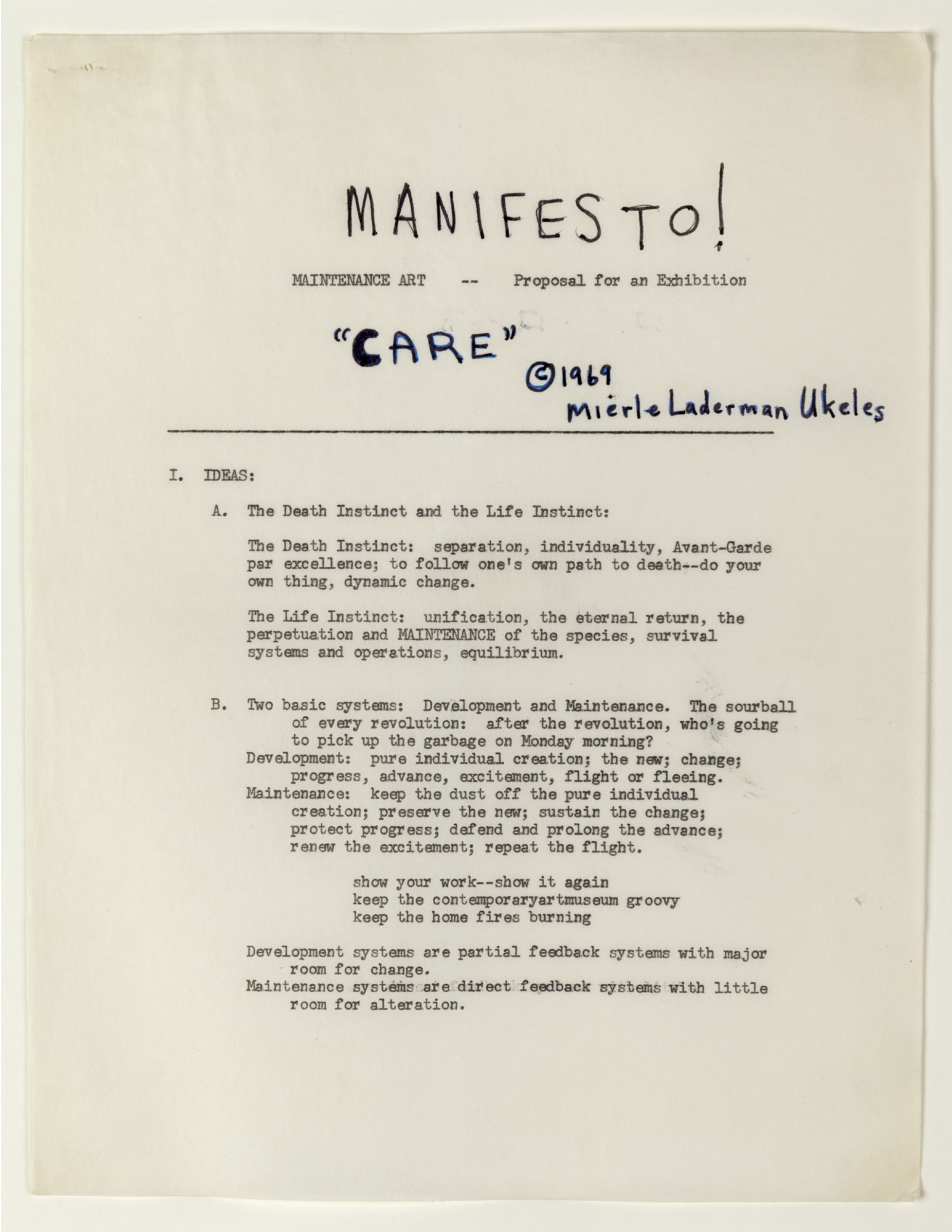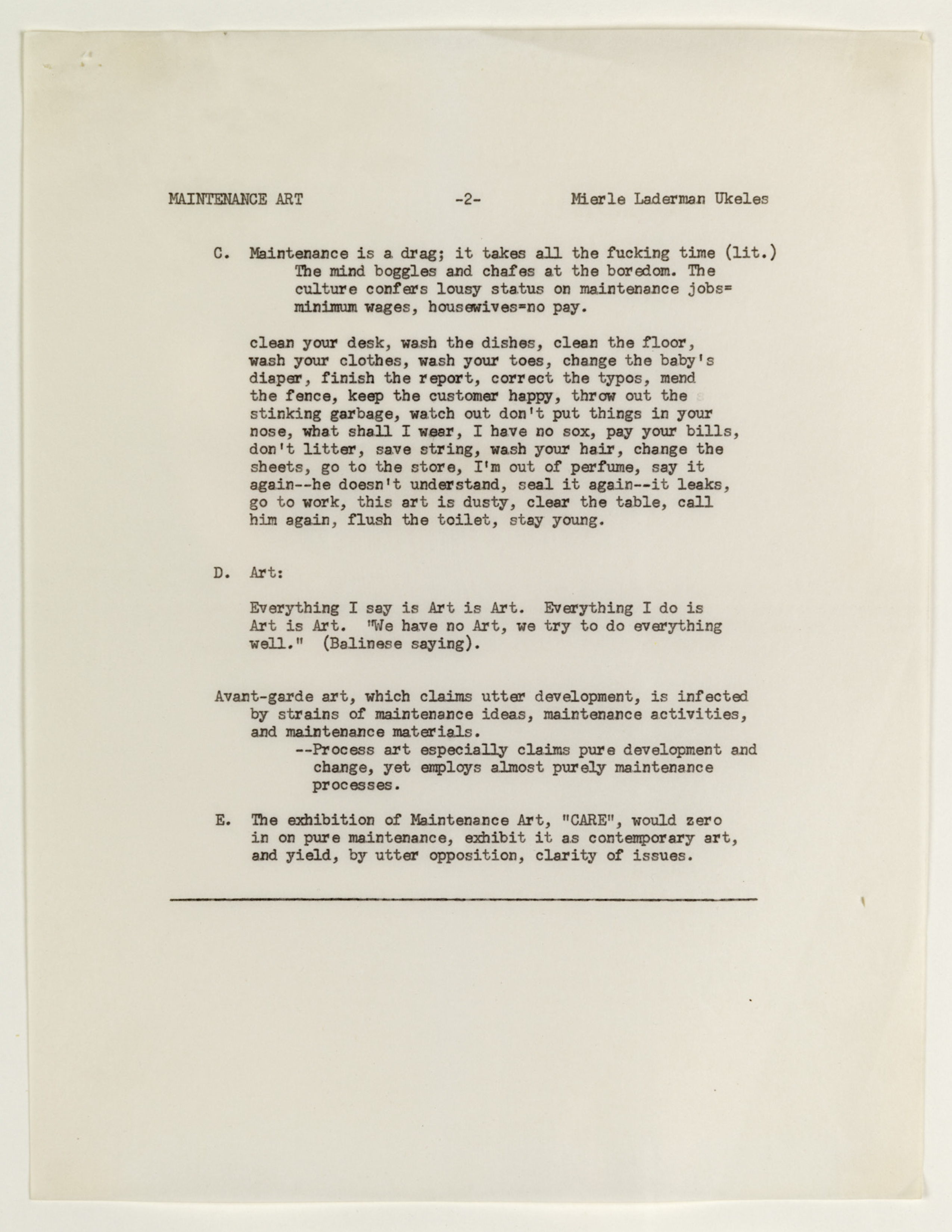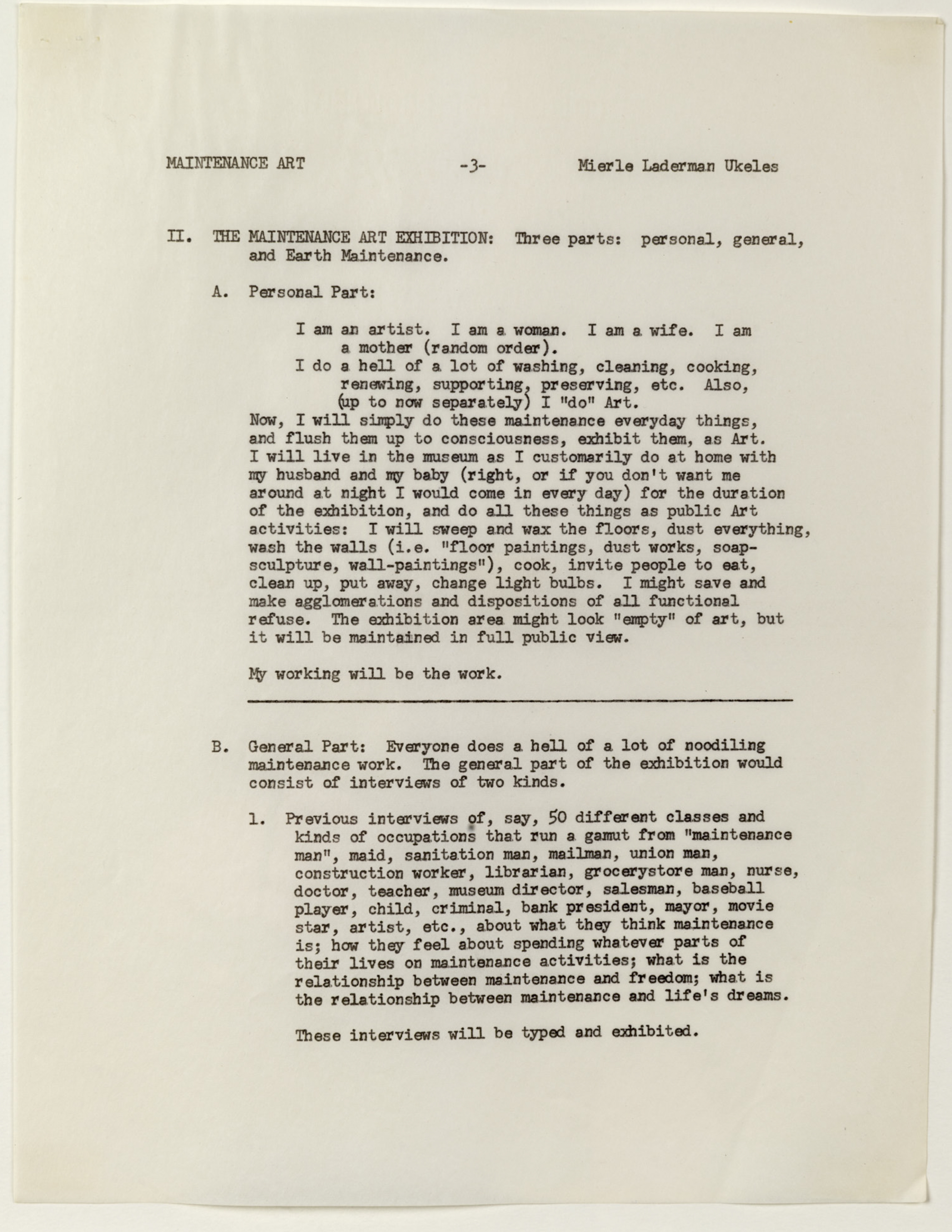 1) 유켈리스의 유지 예술 선언문, 1969(Manifesto for Maintenance Art, 1969!) 에서 발달(development)와 유지관리(maintenance)를 두 개의 기본 체계로 구분한다. 작가는 선언문 앞문단에서 질문하고 있다. 혁명 후, 월요일 아침에 쓰레기를 청소할 사람은 누구인가?(After the revolution, who’s going to pick up the garbage on Monday morning?) 이 문장에 바로머릿속에 꽂혔다. 글을 쓰고 기획을 하고 돌아온 이후에도 멈출 수 없는 가사노동과 육아는 결국 나의 삶을 지탱해주는 원동력이자 연속적인 일이기도 하다.