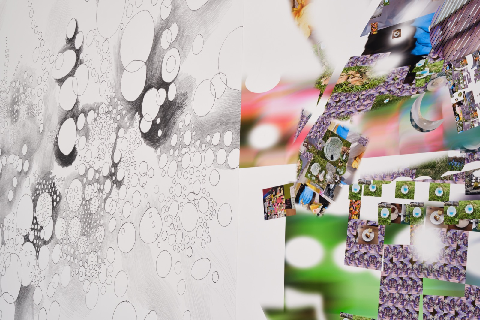 <Vulnerable and Naked>(2025)는 말 그대로 “아무 방어 없이 그대로 드러난 상태”를 뜻한다. 작가의 말을 빌려 보면, ‘완전한 무방비 상태’라는 뜻으로 문학에 많이 쓰인다고 한다. 온라인상 알고리즘에 얽힌 그의 상태에 대한, 몇 년 동안의 누적된 피로를 풀기 위한 도피를 생각한다. 자본주의 알고리즘에 질려버려서 이제 보고 듣는 것은 좀 쉬고 싶은 마음이지 않았을까. 작가가 직접 시라큐스의 Light Work 레지던시를 지낼 때, 모은 이미지들로 구성된 작품이다. 이 인쇄된 종이 뭉치들은 그대로 둘둘 말려 있고, 느슨한 상태의 종이로서 자신의 역할을 잘 해내고 있었다. 흥미로운 점은 종이의 미세한 관성이 직접 손에 닿지는 않았지만, 밀도가 눈으로 느껴졌다. 미술을 전공했거나 입시를 경험해 본 사람이라면 누구나 연필 소묘에 익숙하다. 가장 기본적인 훈련이자, 동시에 가장 친근한 표현 수단이기 때문이다. 작가 오가영에게도 드로잉은 단순한 준비 과정이 아니라, 이미지를 다루는 하나의 방식이다. 그는 사진 이미지를 그대로 보여주는 것에서 나아가, 그것을 하나의 덩어리처럼 제시하고 싶었다고 말한다. 그래서 화면에는 추상적인 드로잉이 더해진다. 물방울인지, 공기 입자인지, 반복된 원과 음영을 주고 있는 연필 선의 투박한 교차가 종이 위를 이리저리 유영하듯 흐르다 보면 다시 출처를 알 수 없는 이미지들을 만난다. 공기 흐름이나 습도에 따라 변형되는 종이에 집중하다 다시 또 쌓인 음영 처리가 된 이미지들을 만난다. 쌓인 이미지 예를 들어 귤 껍질, 먹다 만 케이크, 뇌 사진, 색이 고운 꽃 등 예고 없이 내 머릿속으로 들어와 내 신경을 건드리고, 일치하지 않은 기억을 꺼내고, 넘기고, 들여다보며 내 기억 속을 헤집고 다닌다. 불완전하고 비완성적인 형태가 견고해져 오히려 설득력을 강화한다.
