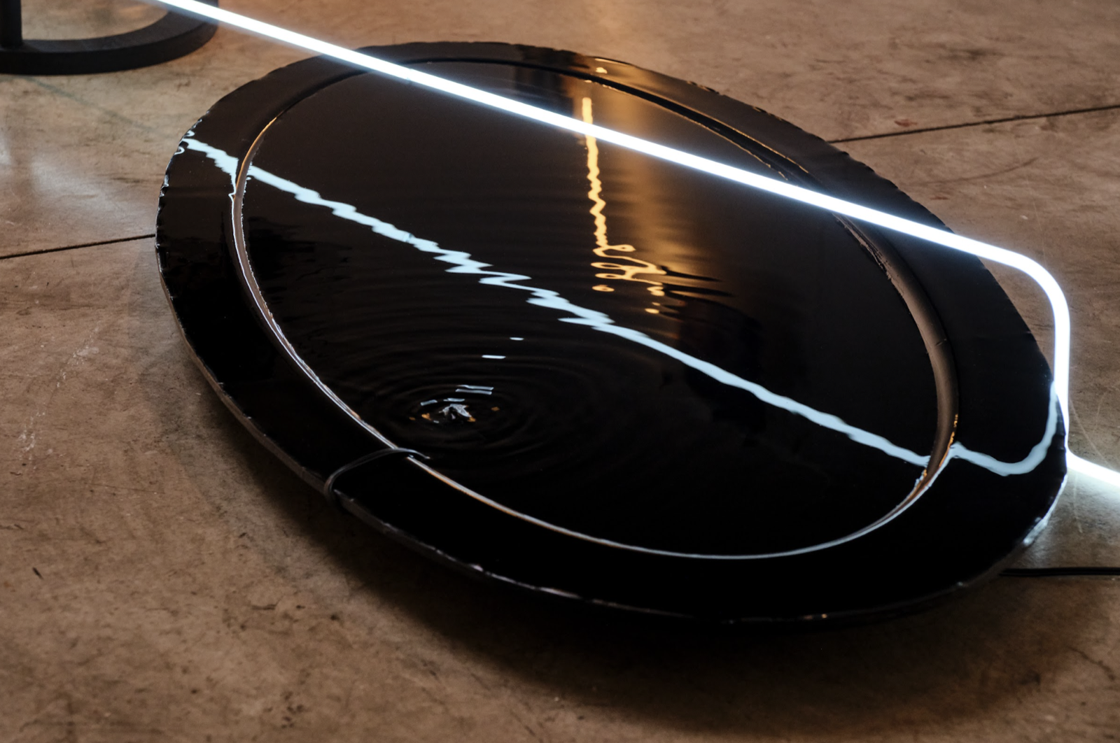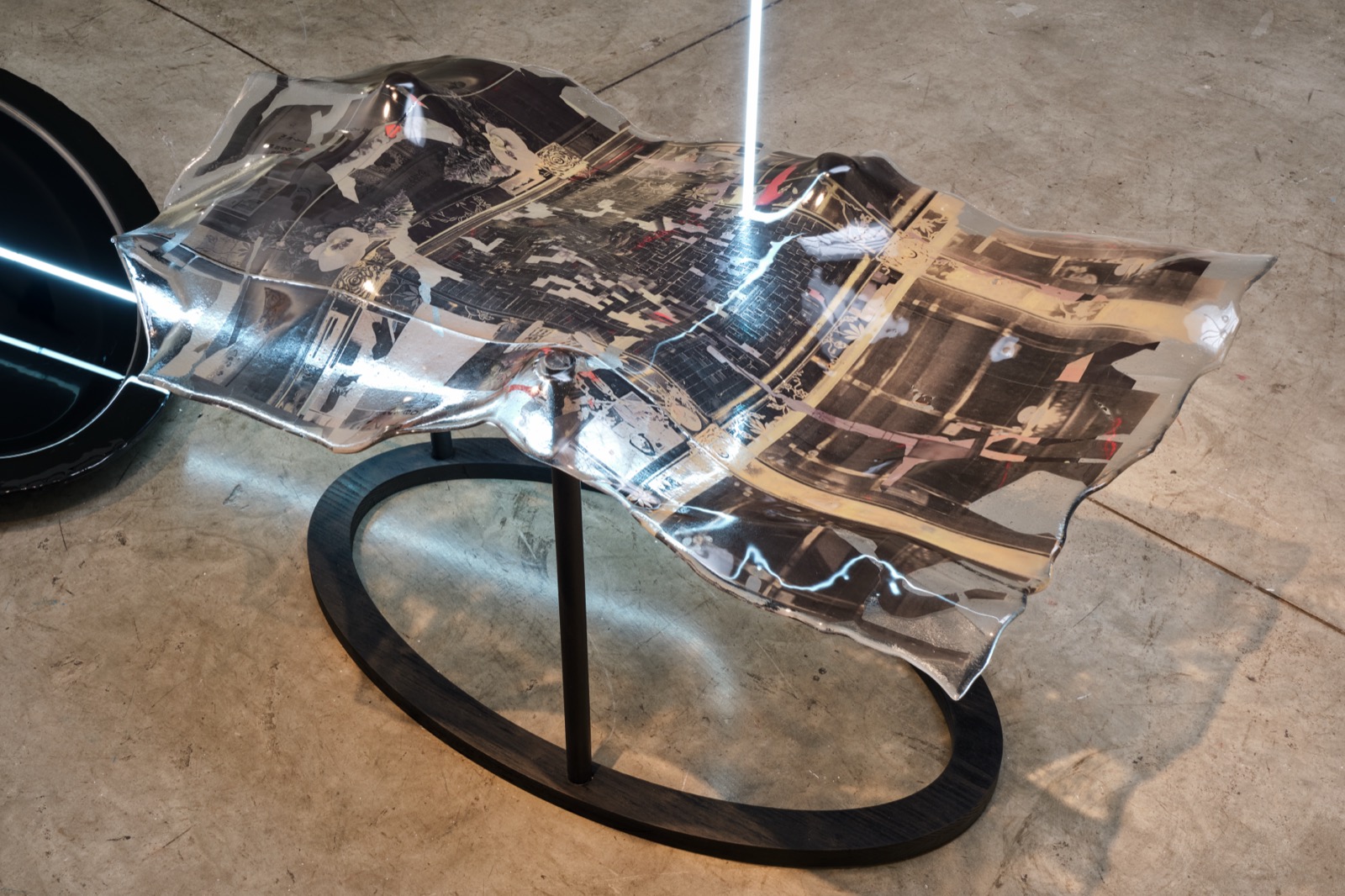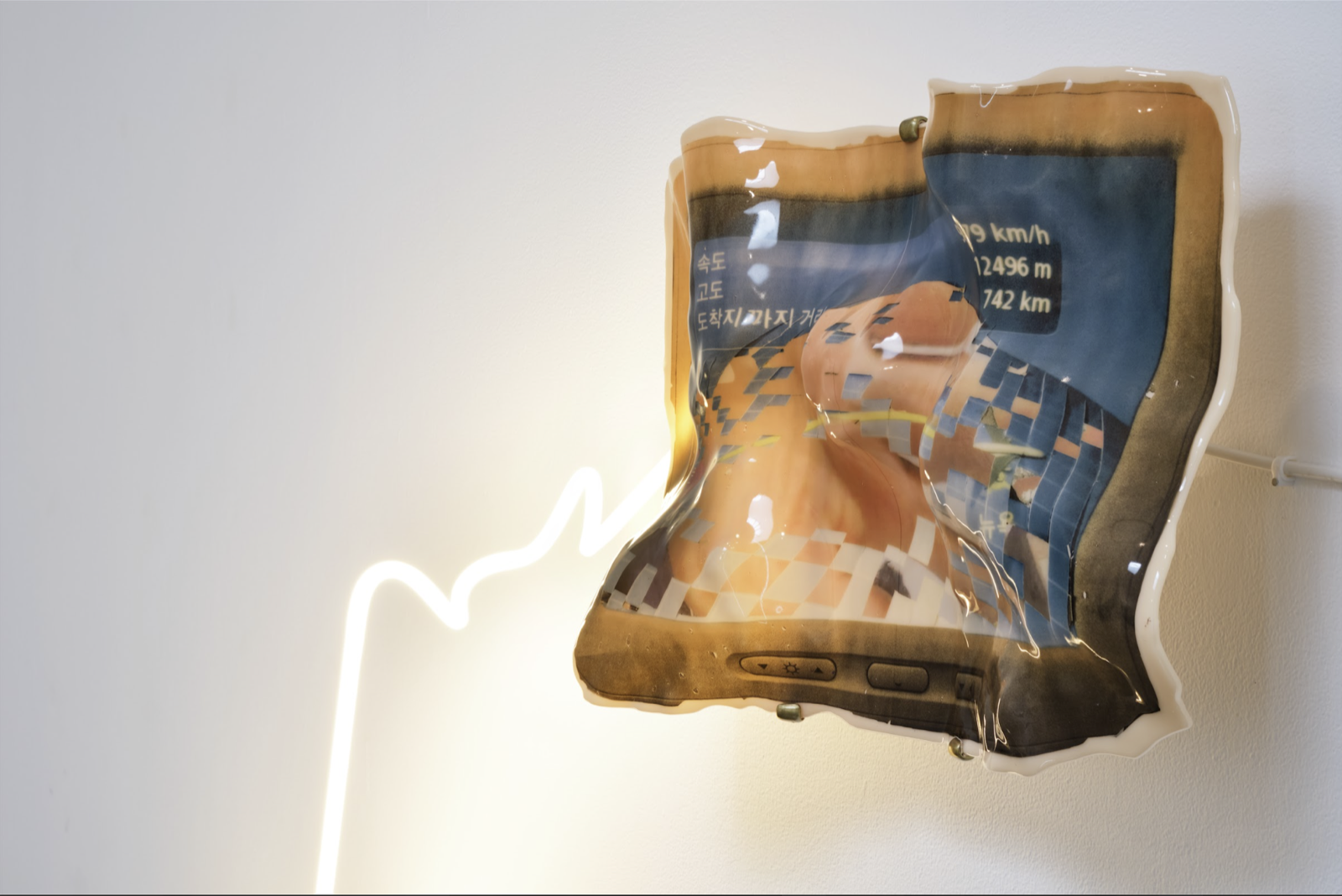 반면 시선을 옆으로 옮기면, 물결 위에서 투명한 무언가 미묘하게 반짝인다. 이주연은 유리를 직접 제작하는 작업 방식에서 출발한다. 그는 직접 만든 안구 형태의 유리 렌즈를 사용해 사진을 촬영한다. 액체 상태의 유리를 기다란 봉에 묻혀 끊임없이 회전시키며 형태를 만들고, 표면이 완벽하게 다듬어지지 않은 불규칙한 렌즈를 카메라 렌즈 앞에 두어 이미지를 포착한다. 이후 촬영된 사진은 프린트되어 잘리고, 손으로 엮이는 과정을 거치며 또 다른 실험으로 확장된다. 할아버지의 장례에 참석하지 못한 개인적 경험에서 출발한 신작 〈Bodiless Travels〉(2025)와, 할머니와의 텔레커뮤니케이션을 통해 친밀감과 거리감을 스크린 안에서 연결하고자 했던 〈Parabolic Traces〉(2025)는 애도와 상실, 그리고 부재의 감각을 다룬다. 이 작품들은 개방성과 감수성, 그리고 소유될 수 없는 관계에 대한 정서를 환기한다. 인간이란 끝없이 경계가 열려 있는 관계 속에서 타인과 얽혀 존재한다는 사실을 작품은 조용히 상기시킨다. 작품 속에는 익숙한 휴대전화 영상통화 화면이 등장하고, 그 옆에는 비행기 좌석 앞 모니터에서 볼 수 있는 이동 거리와 남은 시간, 현재 위치를 안내하는 화면이 병치된다. 화면 중앙에는 네온사인처럼 이어진 선이 시선을 잇는다. 유리의 물성이 만들어낸 자연스러운 곡면의 변형은, 의도인지 아닌지 여부를 떠나 비행기 창문 너머로 보이는 구름과 바다 사이의 산등성 같은 지형을 연상시킨다. 물리적 거리를 자신의 작업 안으로 끌어와 감각적으로 좁히려는 작가의 의도가 이 장면에서 선명하게 드러난다. 애착 대상에 대한 좋은 시선. 붙잡아 두고 싶어 하는 기억일지도 모르겠다. 전시장과 천장을 수직으로 나누고 있는 네온사인이 공간의 축처럼 솟아 있다. <Weighing of the Light>(2025)에서는 디지털화 된 사진은 무게가 없는 반면, 작가가 그리워하는 가족들은 실체, 결국 존재하는 것들의 무게를 사진으로는 어림짐작만 가능함을 보여준다. 빛은 질량이 없고, 디지털화 된 이미지들은 화면 안 속에 갇혀 실체 없이 떠돌아다닌다. 떠돌아다니는 듯한, 일시적으로 연결되는 순간들, 기억조차 나지 않는 순간 들에 몸을 부여하고 싶다는 욕구에서 작업이 시작된다고 한다. 각기 다른 시간에 발생한 행위와 경험이 반복과 침전, 응축이 얽혀 드러나는 지점이 시간과 기억, 유리와 빛으로 연결되어 있다. 작업을 뚫고 흐르는 물을 지나가는 네온사인과 그 사이를 흐르는 물은 여러 방향으로 모이고 흩어져 찰랑거린다. 기억의 멈춤을 손으로 직접 만지고, 형태를 만들어 가며 작업의 몸체를 만든다. 다른 장소와 시간을 담은 사진들을 출력해 얇게 자른 후, 위빙 기법3)으로 엮는다. 작가는 현존했던 것들을 기억과 상상, 투영 속에서 작업처럼 엮어 끊어지지 않게 붙잡아준다. 시간이 흐르면 서서히 끊어지고 희미하게 흔적을 남기겠지만 이어져 있다는 안도감이 그를 존재케 한다.