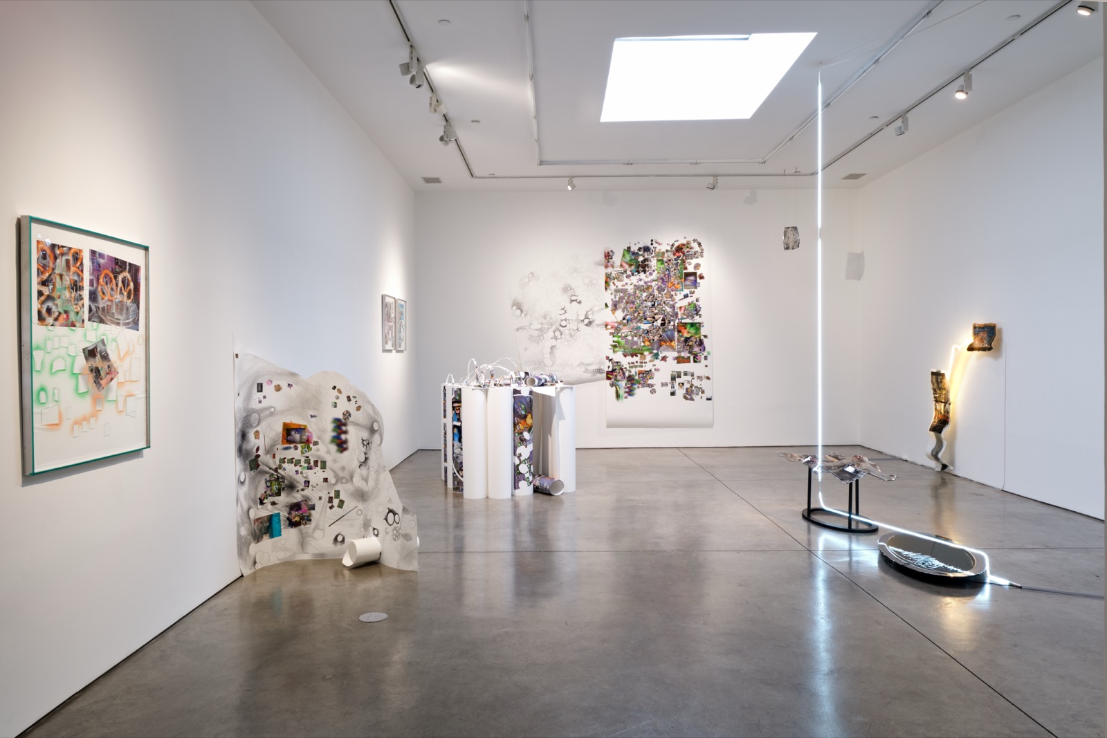 곡선이 없는 높다란 천장의 Baxter St Camera Club 전시 공간은 전형적인 하얀 큐브 형태로 다소 딱딱한 인상을 준다. 그러나 이 공간 안에서 오가영의 종이가 만들어내는 굴곡진 흐름과 이주연의 다듬어진 유리 곡선은 부드럽고 끊어짐 없이 이어지며, 동시에 견고한 움직임을 보여준다. 서로 다른 재료에서 비롯된 이 유연함은 오히려 신선하게 다가온다. 전시장에 들어서면 두 작가가 사용하는 재료의 대비가 가장 먼저 눈에 띈다. 비록 ‘유리’라는 공통된 재료가 사용되지만, 그 접근 방식은 분명히 다르다. 오가영은 유리를 단순히 사진을 지지하는 물리적 기반으로 다루지 않고, 이미지 구성의 적극적인 일부로 활용한다. 일반적으로 사진에서 이미지를 담은 프린트가 중심이 된다면, 오가영은 그 사진을 감싸는 액자와 프레임, 즉 이미지를 둘러싼 구조 자체를 다시 사유한다. 유리가 사진을 보호하는 목적을 벗어나, 프레임 밖으로 나와 직접 자르고 조각을 내어 작업 위에 붙인다. 그러니까 처음부터 유리를 만드는 것이 아니라, 납작한 유리에서 어느 정도 직접 자르고 붙일 수 있는 수준의 개입이다. 신작 <Double Glass Series - Midnight in Midtown>(2025)을 살펴보면 자른 유리와 본인이 수집하고 촬영한 이미지가 겹쳐 있다. 빛의 굴절이 일어난 것처럼 유리 자른 유리 위의 이미지는 더 선명하다. 이미지에서 보이는 프렛젤(pretzel)과 선인장, 아무 상관 없는 두 이미지의 대비는 우리를 아무 의심 없게 바라보게 한다. 사진은 완전하냐는 질문은 유리와 이미지 사이 균열을 통해서만 비로소 설득력이 있다. 옆을 살짝 도는 순간 넘어질 듯 넘어지지 않는 종이가 벽에 붙어있다.