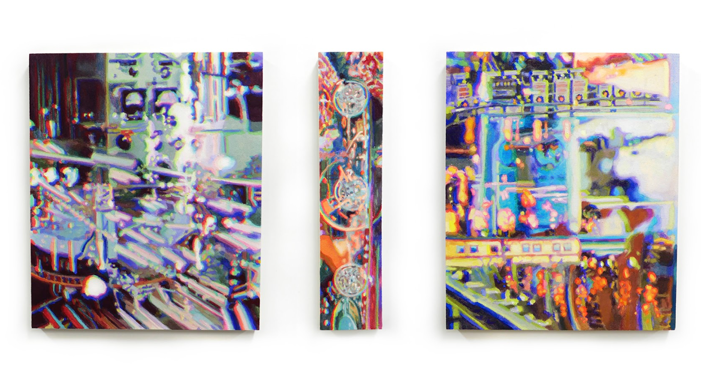 [3] 김리나, <Playback Mechanism>, 2025, 광목에석채, 37.9 x 145.5 cm, 김리나 <Factory Operation Series>, 2025, 광목에 석채, 좌측 부터 45.5 x 37.9 cm, 45.5 x 37.9 cm, 45.5 x 10 cm